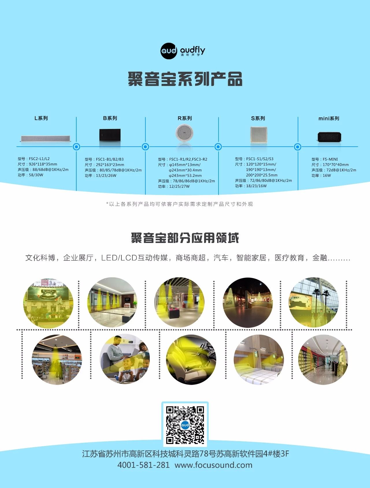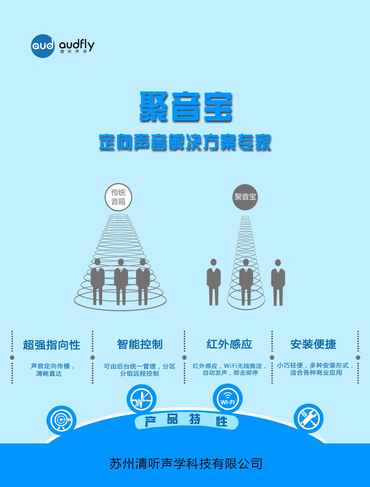 聚音寶是一款融合了定向聲技術(shù)的高科技超指向揚聲器,憑借其聲音超強指向性、音源立體定位以及防治噪音產(chǎn)生等特點,截至目前,已廣泛應(yīng)用于博物館、展廳等展覽展示工程、LED/LCD音視頻廣告集成、商場超市、銀行、醫(yī)院、汽車等20多個行業(yè)領(lǐng)域,提供專業(yè)的定向聲解決方案。