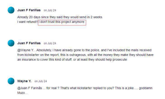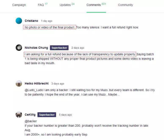 由于Muzo自公布了產(chǎn)品理念視頻后,就再也沒有相關(guān)產(chǎn)品的信息流出。一開始熱情高漲參與眾籌的朋友,既不了解產(chǎn)品的生產(chǎn)進程,又查不到物流信息,紛紛對Muzo失去了信心和耐心。
